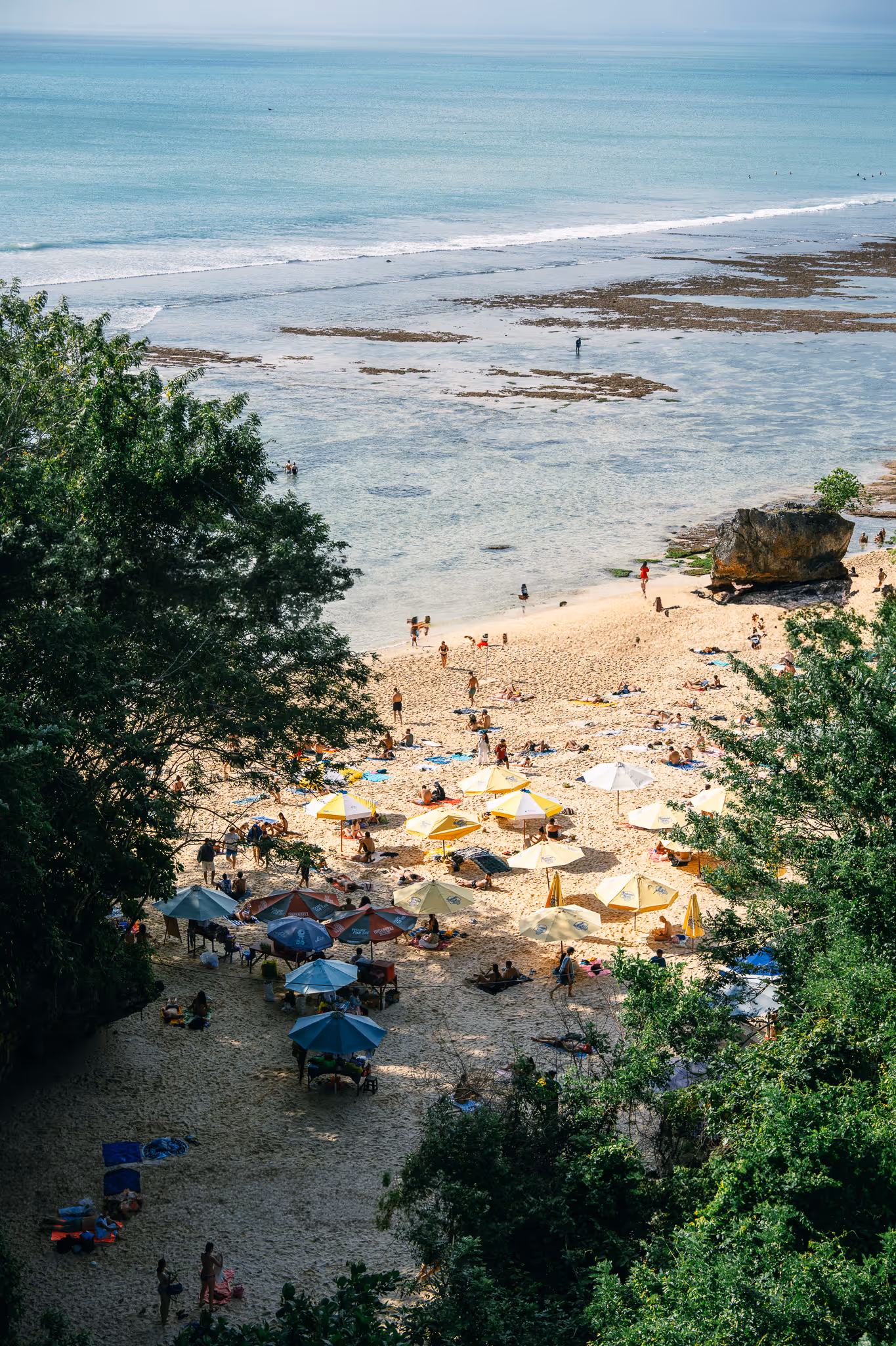 Tide-dependent but beautiful. At low tide, the beach opens up. Perfect for a relaxed vibe, beach cafes and watching waves crashing on the reef. It's also one of Uluwatu’s most famous surf spots.